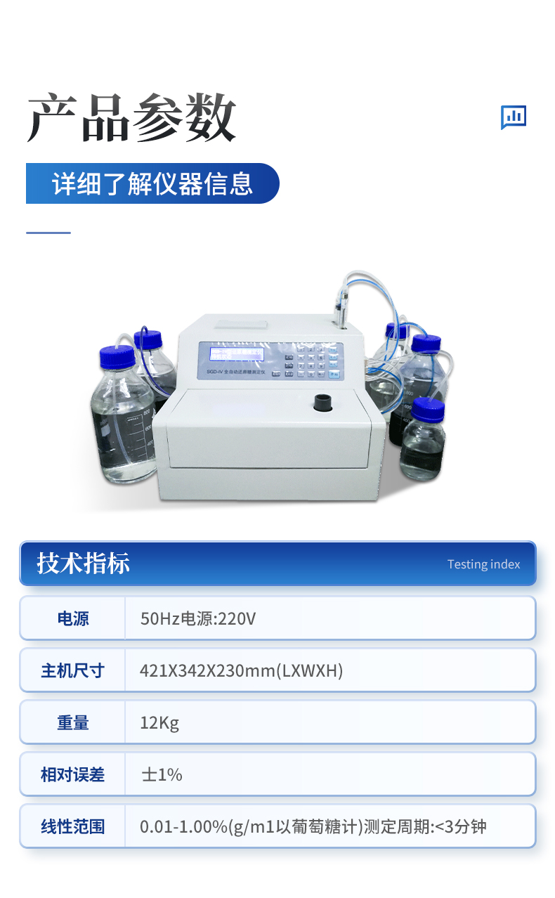 | 電源:50Hz電源:220V | 主機尺寸:421X342X230mm(LXWXH) | 重量:12Kg | 相對誤差:士1% | 線性范圍:0.01-1.00%(g/m1以葡萄糖計)測定周期:<3分鐘 |