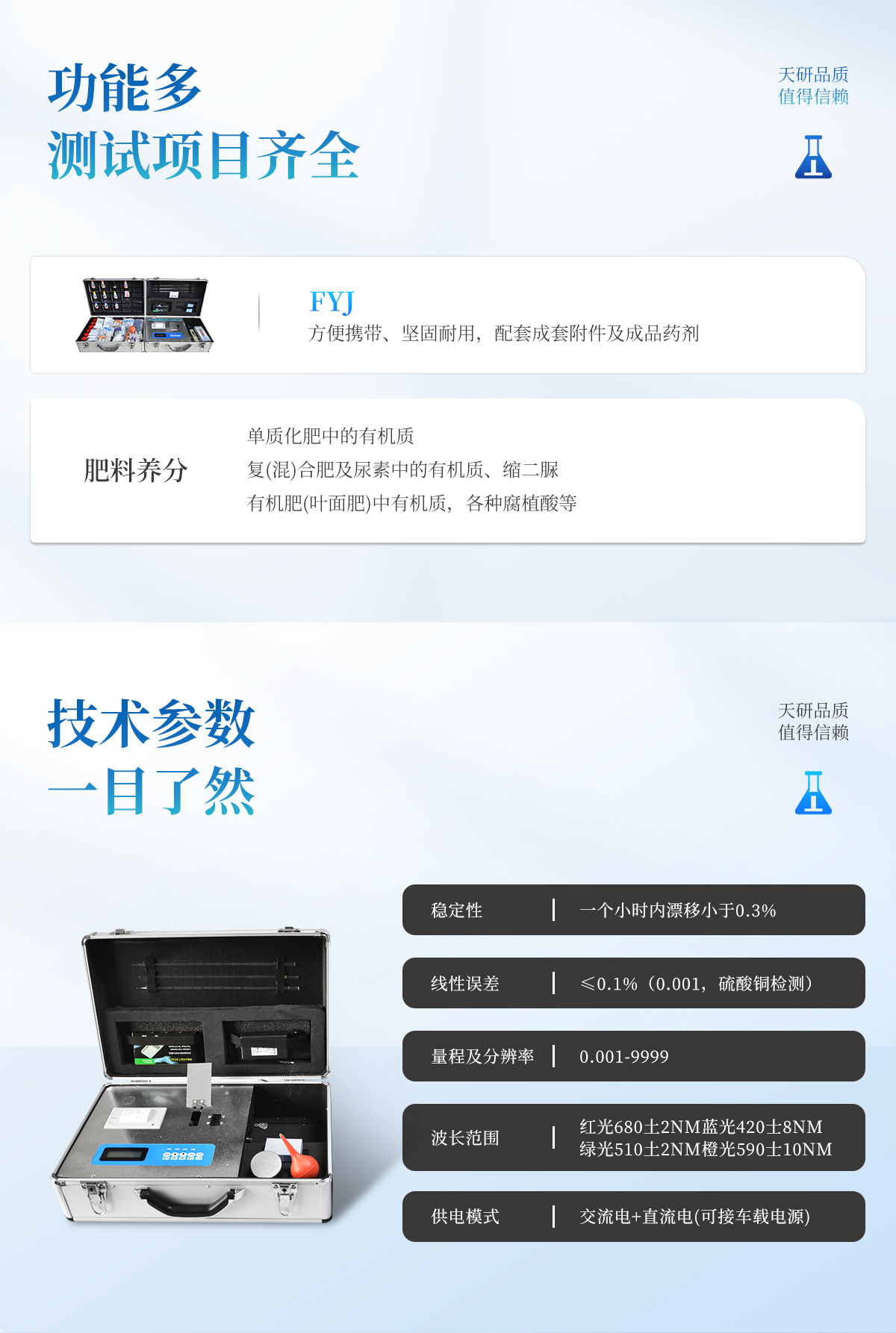 肥料養(yǎng)分專用檢測儀功能全:測試項目國內(nèi)外*全(各類藥劑均可選購)。配套齊全,該儀器集藥、器、儀為一體,攜帶方便,相當(dāng)于一個小型實驗室,用戶只需提供蒸餾水即可在要求時間內(nèi)完成全部操作。適于農(nóng)業(yè)服務(wù)部門或農(nóng)資經(jīng)銷商鑒別肥料真假、肥料廠商肥料生產(chǎn)中控、農(nóng)資質(zhì)檢部門進(jìn)行農(nóng)資打假,規(guī)范農(nóng)資市場。性能可靠:工作穩(wěn)定性優(yōu)于國家標(biāo)準(zhǔn)JJG179-90指標(biāo)的10倍以上,重復(fù)性達(dá)到光柵型分光光度計指標(biāo)水平。