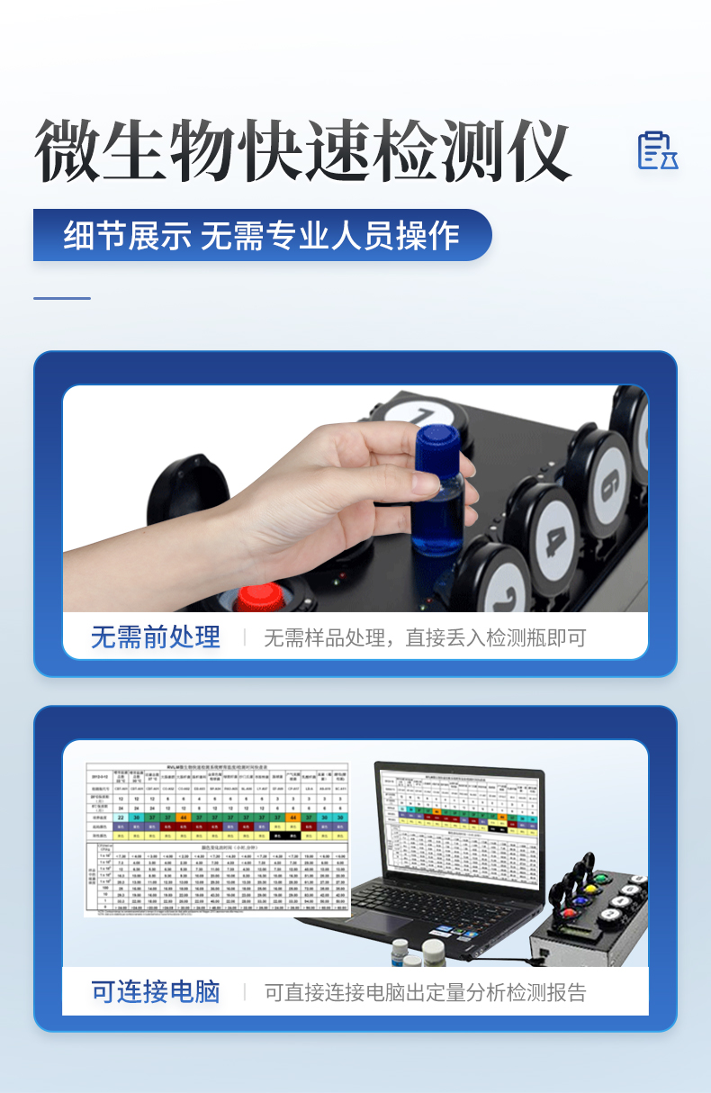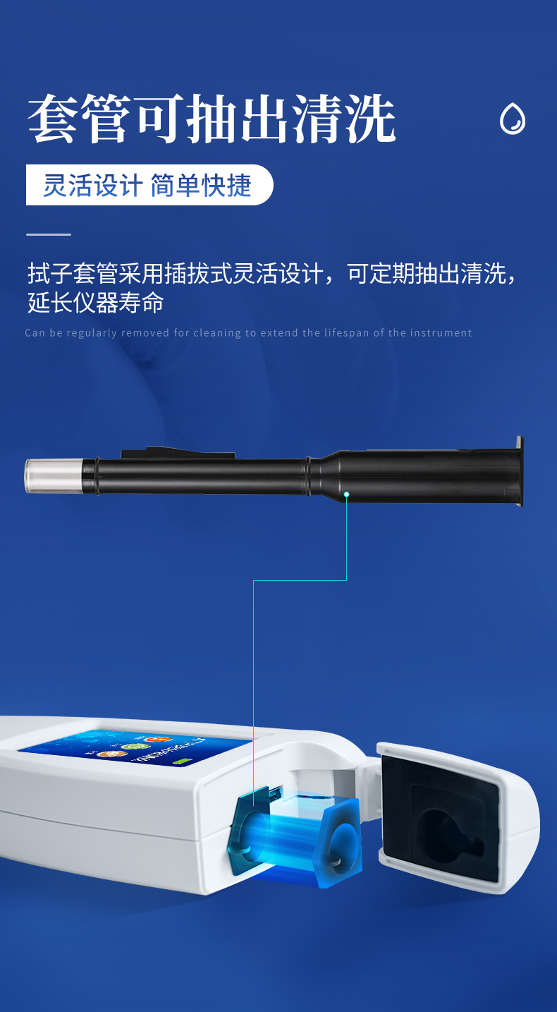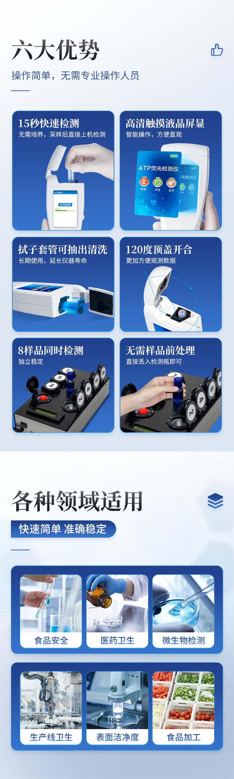 | 實(shí)用性 —— 可根據(jù)環(huán)境檢測需求設(shè)定上下限值,做到數(shù)據(jù)快速評估預(yù)警,表面潔凈度快速篩查。 | 靈敏度高 —— *************** | 速度快 —— 常規(guī)培養(yǎng)法18-24h以上,而ATP只需要十幾秒鐘 . | 可行性 —— 微生物數(shù)量與微生物體內(nèi)所含ATP有明確的相關(guān)性。 通過檢測ATP含量,可間接得出反應(yīng)中微生物數(shù)量 | 可操作性 —— 傳統(tǒng)培養(yǎng)方法需要在實(shí)驗(yàn)室由經(jīng)過培訓(xùn)的技術(shù)人員進(jìn)行操作;而ATP快速潔凈度檢測操作非常簡便,只需簡單的培訓(xùn)即可由一般工作人員進(jìn)行現(xiàn)場操作。 | 體驗(yàn)更好 —— 試子套管采用插拔式靈活設(shè)計(jì),可定期清洗長期使用,延長儀器壽命。 |